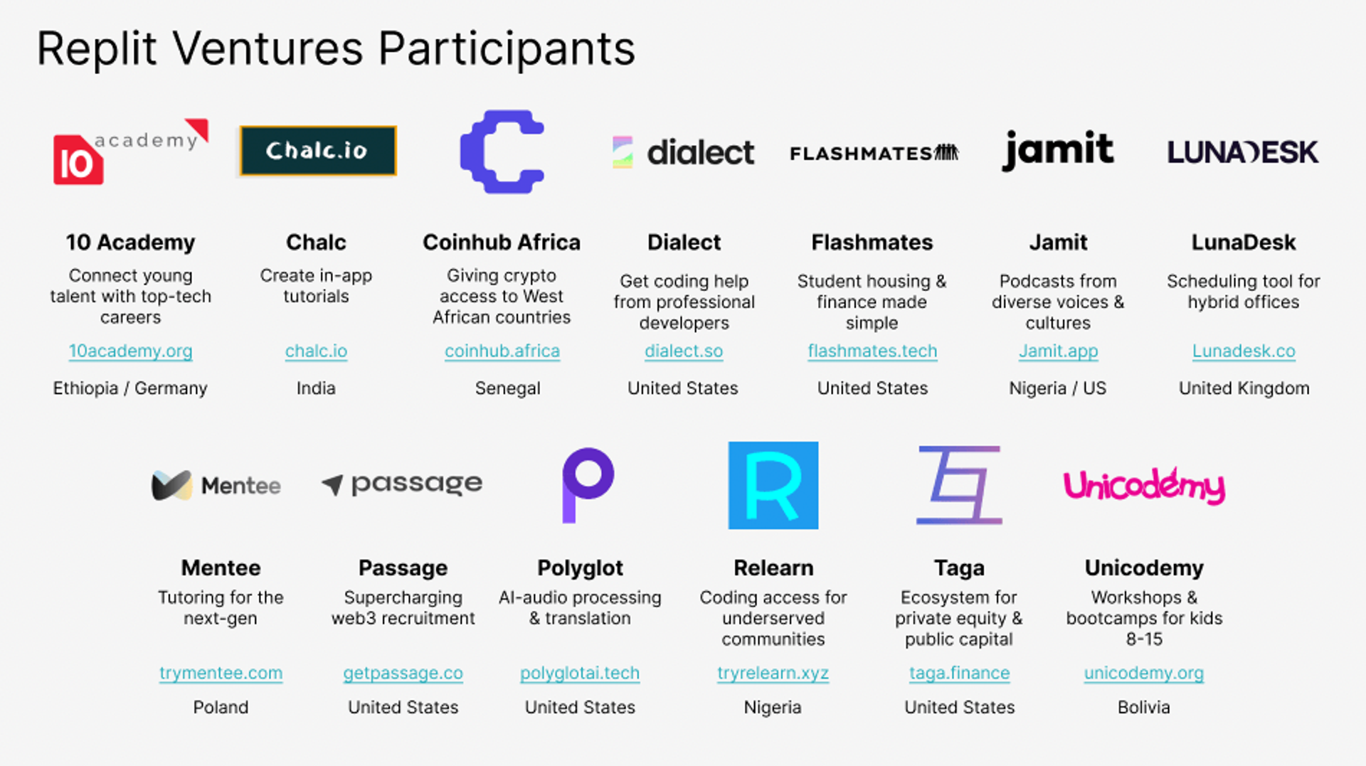 With over 150 applications from +25 countries, the Replit Ventures 2022 (RV1) field was extremely competitive. Today, we are excited to welcome 13 teams. The teams offer a variety of geographies (9 different countries), missions (2 non-profit, 11 for-profit), and industries (e.g., Web3, Entertainment).
