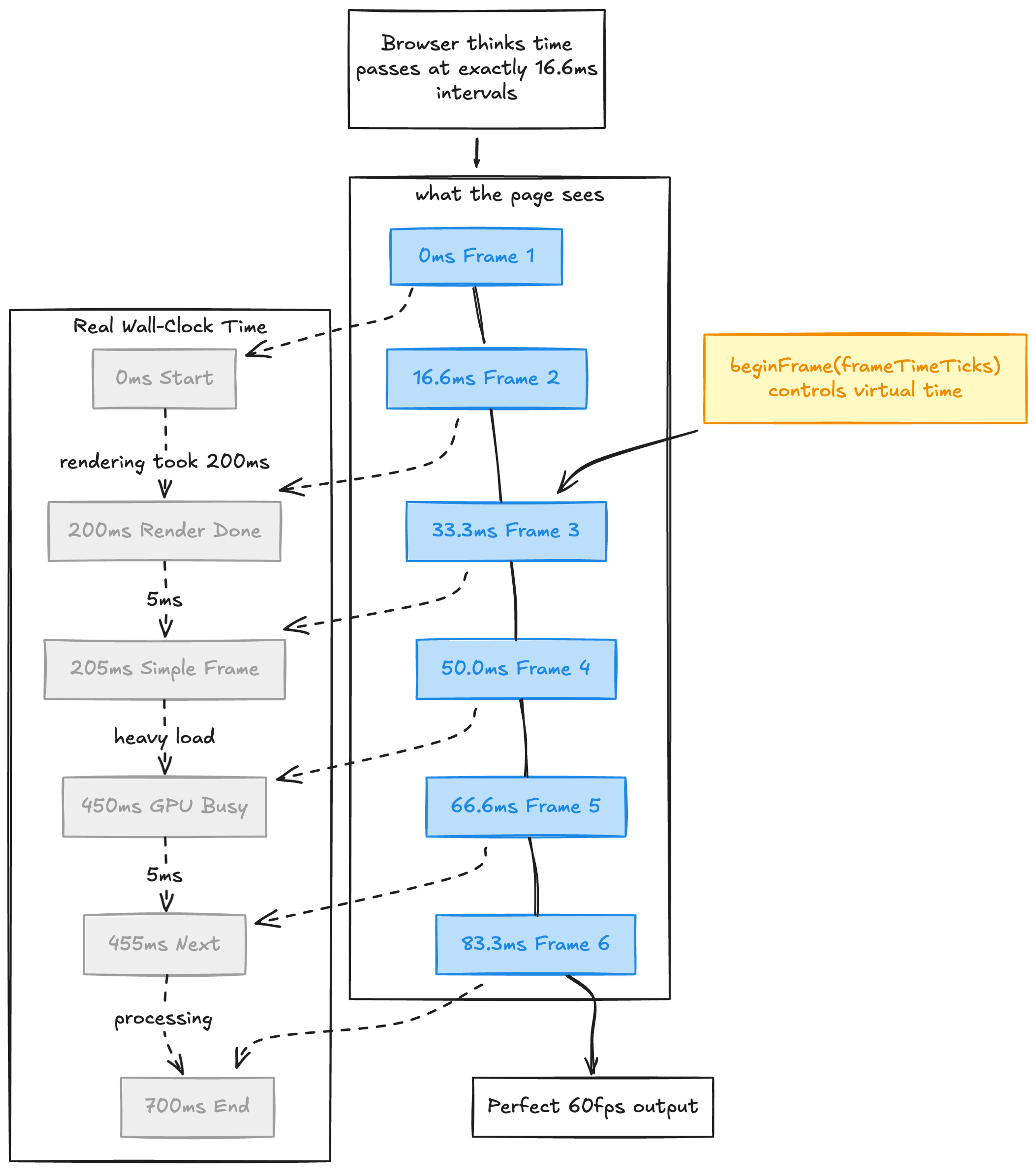 Because they solve different problems. Chrome's flags control how the rendering pipeline behaves: synchronous compositing, no skipped frames, no partial renders on background threads. But the page's JavaScript doesn't know about any of that. setTimeout(fn, 1000) still fires based on wall-clock time. Date.now() still returns the real timestamp. requestAnimationFrame callbacks still get the real frame timestamp. Our JavaScript shim controls what the page's code thinks time is; the Chrome flags control how Chrome paints. Without the flags, the compositor might decide it doesn't need to repaint. Without the shim, your animation library is looking at the real clock and wondering why frames are arriving 200ms late. You need both layers.