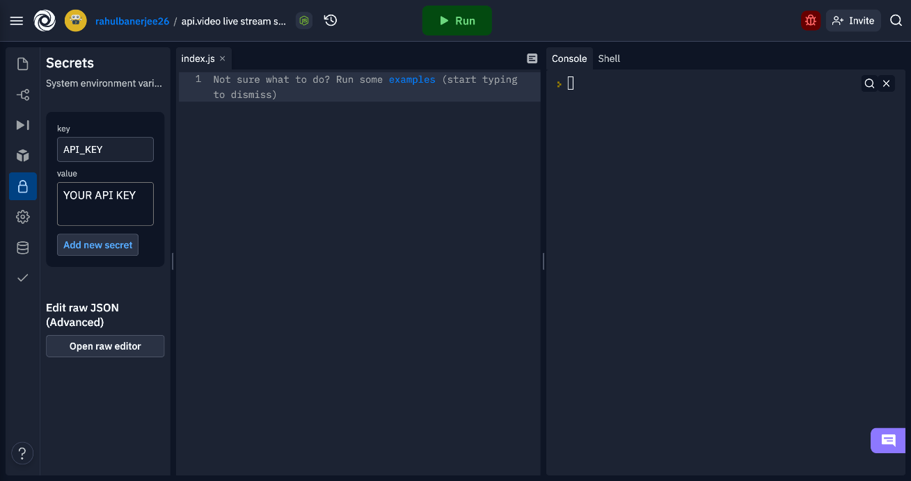 Save your api.video API Key as an environment variable. Replit has a feature that allows you to conveniently store your secrets as environment variables: