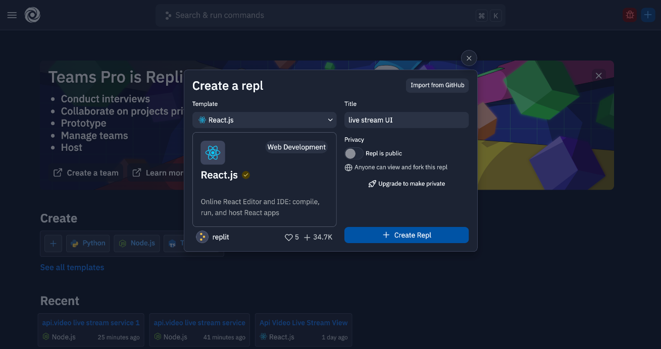 In this tutorial, you will build your own livestream service using api.video’s Node.js Client. You will then create a simple React App to host your livestream. All the development will be done using Replit, an in-browser IDE that supports more than fifty languages.