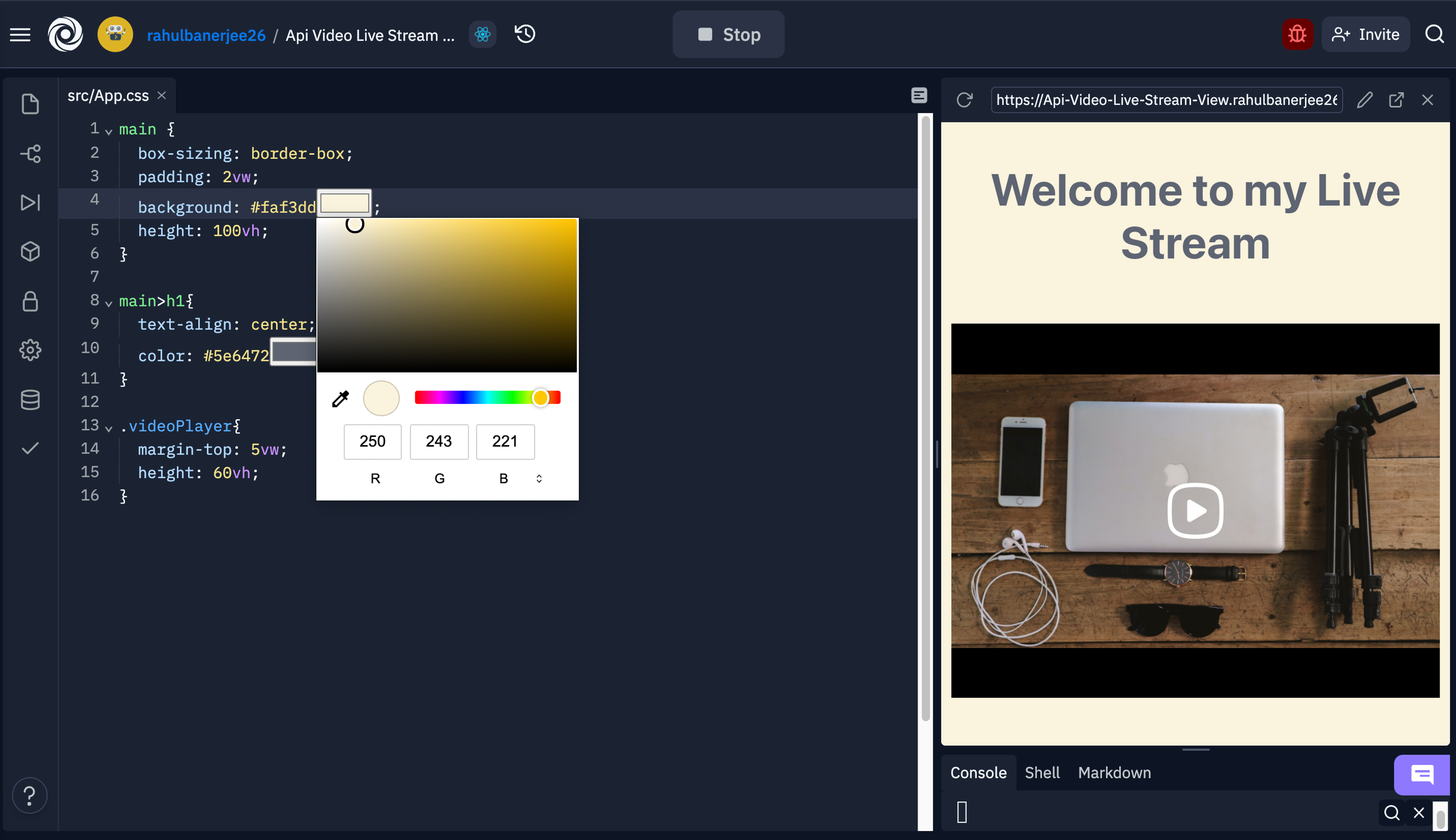 In this tutorial, you built your own livestreaming service using api.video. You also created a simple React App for others to view your livestream via Zoom. You were also introduced to Replit, an in-browser IDE that can be used for livestreaming, among many other things. Although this tutorial only discussed support for Node.js and React, Replit supports other languages and frameworks as well, including C++, Python, Vue.js, Svelte, and more.