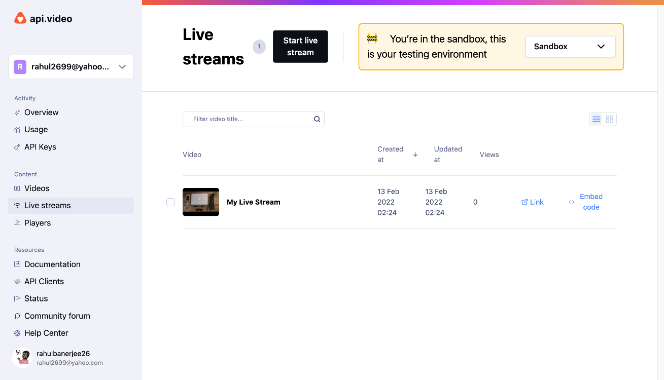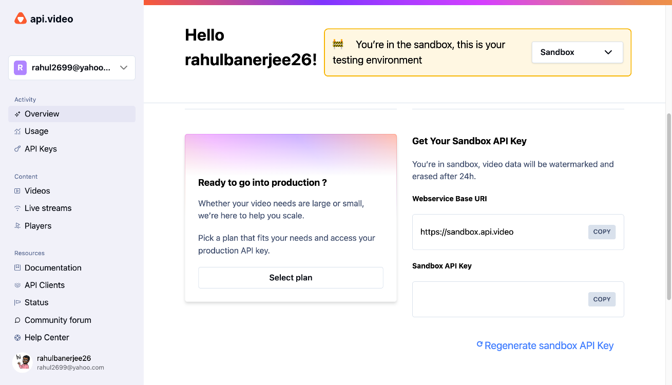 Before proceeding, you will have to create an account with api.video. Once you have an account, log in and head over to your dashboard. Scroll down, and you should see a Sandbox API Key: