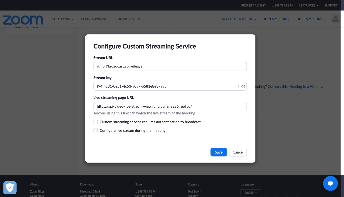 Now, you will need some information from the livestream service you created in the previous steps. Head over to your api.video dashboard and go to your livestream service. Click on the See details option for the service. You should see your stream key and the RTMP Server URL. You’ll need both these values. Go back to your Zoom meeting details. For Stream URL, add the RTMP Server URL from api.video, and for Stream key, add your api.video livestream’s key. Then, for Live streaming page URL, add the URL to your React App. Here’s what my Zoom livestream configuration looks like: