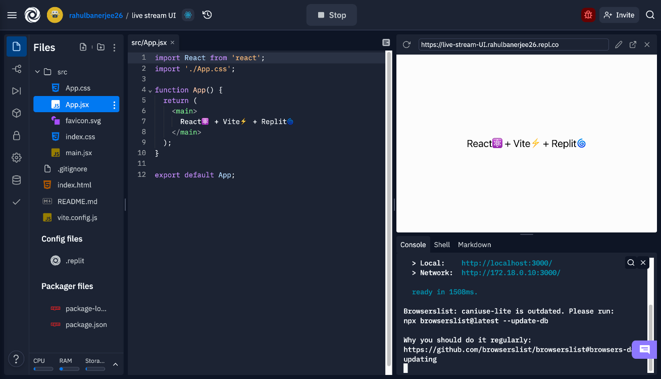 If your repl is public, the URL can be accessed from anywhere and by anyone. Additionally, as long as your repl is running, the URL will render your React App. This is a really useful feature if you want to test your app on different screens or if you want to share it with other developers for testing. Replit also supports live reload by default, so any changes you make in your code will be reflected in the browser almost instantly.