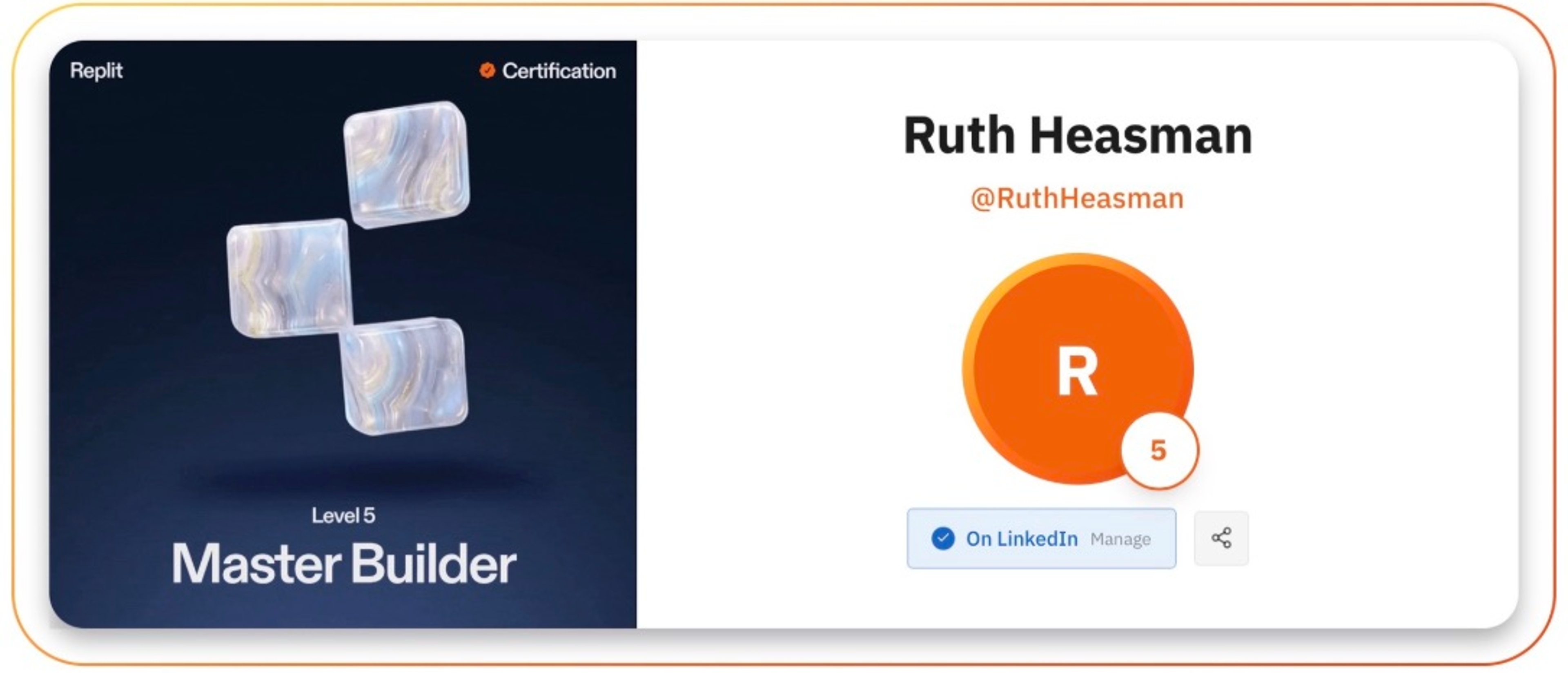 In about a year, that persistence added up. Heasman has built 20+ apps, experimented with many more, and climbed into the top 0.1% of Replit builders as a master builder. When she checked her assessment recently and saw she had leveled from four to five, her reaction was simple: “I’ve impressed myself.”