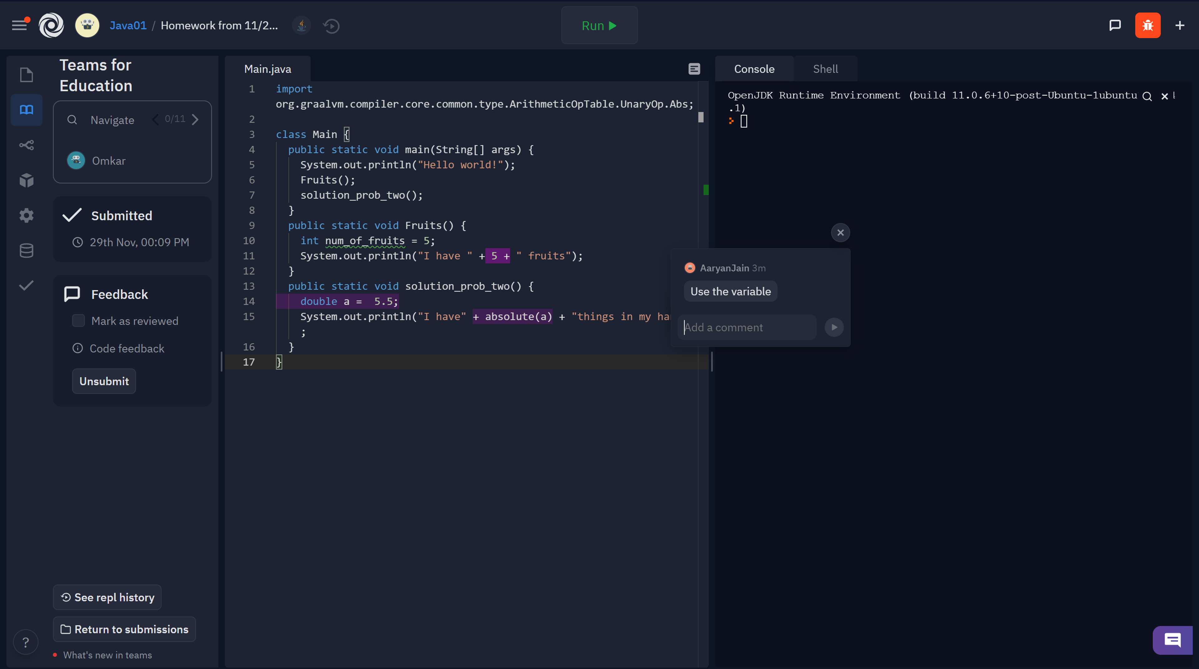 Repl.it makes it a lot easier for teachers to assign different tasks as well. With repl.it teachers can assign homework directly from the website which shows up as an assignment for the student to complete, with a given due date. We can check-in on the students' progress throughout to ensure everyone is on track. Furthermore, we can add annotations to code, which serve as comments without affecting the student's code.