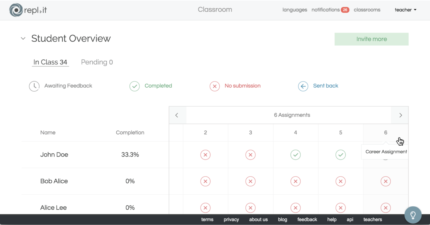 The Student Overview is a feature of the teacher dashboard that we’re introducing. Where previously you had to go into each assignment to see the progress for each student individually (which ironically mirrors the physical classroom experience described above). The teacher classroom dashboard is now divided into assignment and student sections. The assignments section lists out the assignments published or in draft and allows you to create a new assignment. The student section is all about the students, their names, completion percentages for all their assignments and the current submission status.