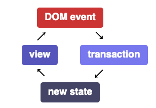 A great illustration of this is how changes to the document are made. Changes to state happen functionally by creating and dispatching a transaction that describes the changes to the document, selection, or other pieces of state (including custom fields specific to your app). This, in turn, tells the view to update itself, at which point it synchronizes the DOM to match the new state. The View also listens for DOM events (e.g. keyboard input), and translates those events into transactions that update the View’s state, and therefore, its content.