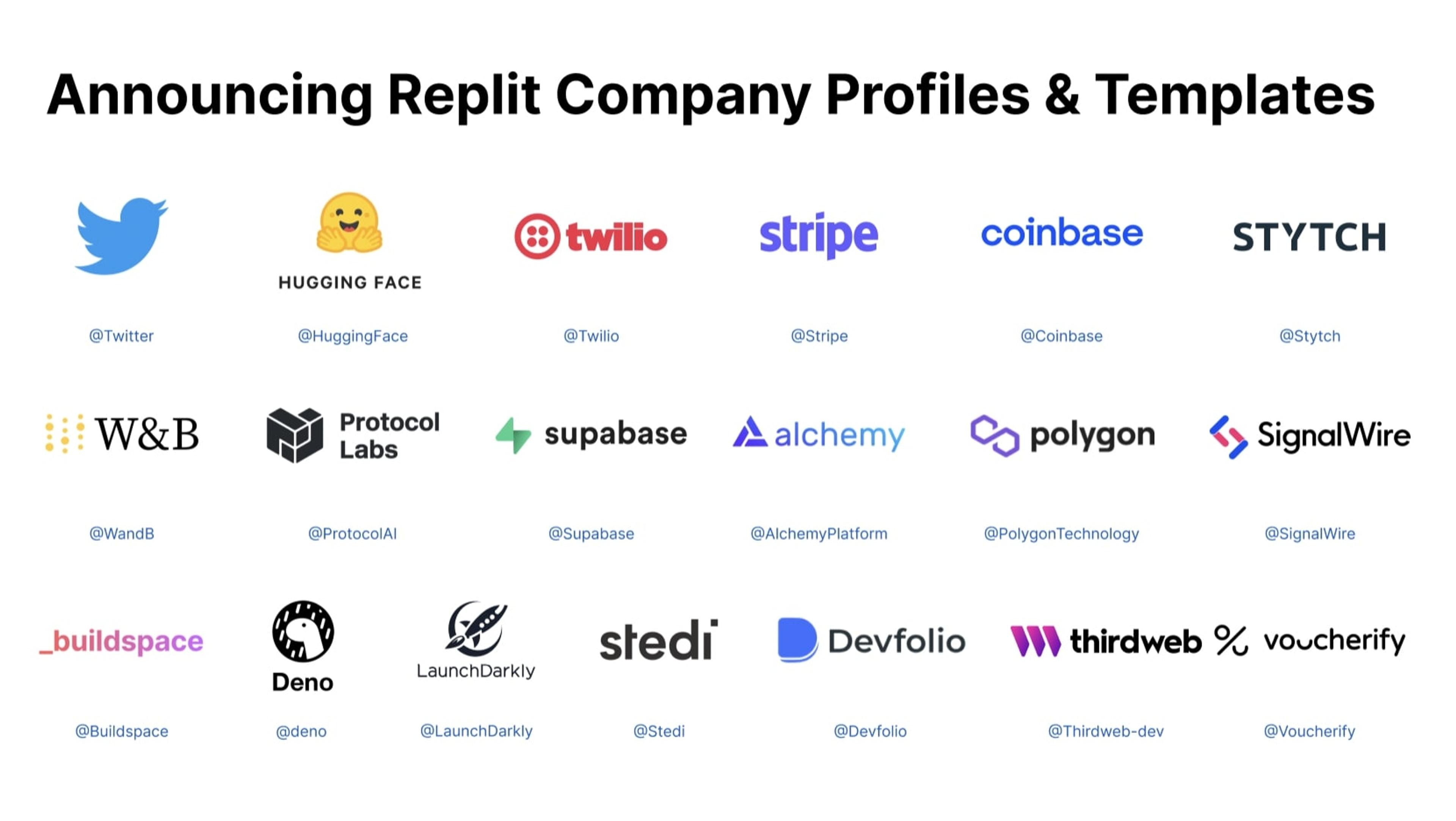 18 companies are already verified and you can build with them on Replit today.