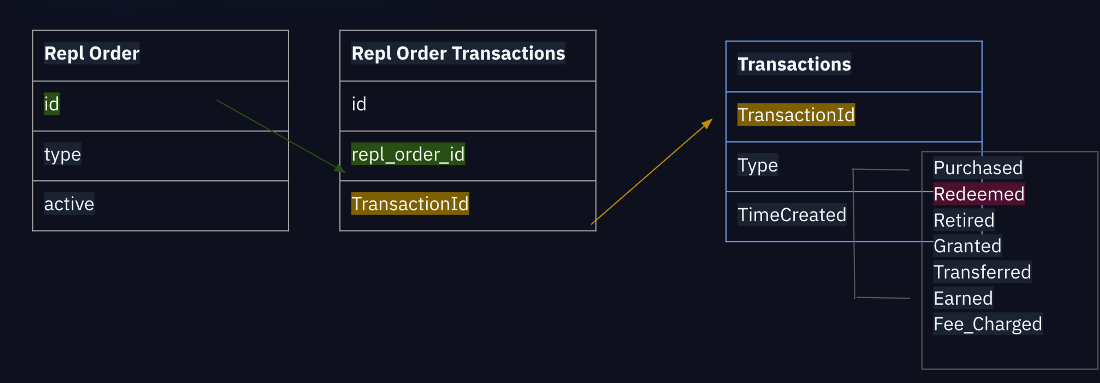 - Then it'll link this Repl order to another transactions table in postgres.