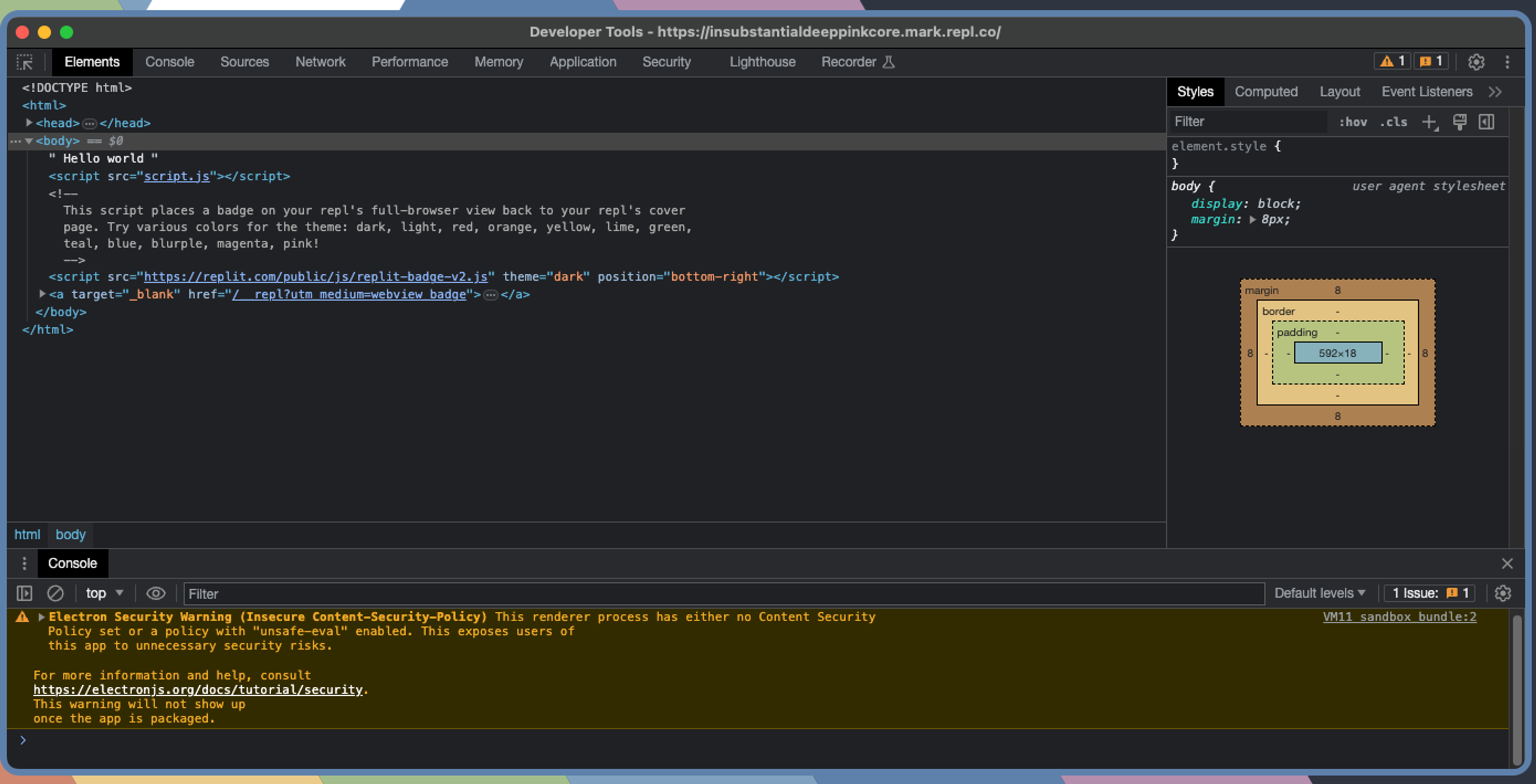 But that’s not the only thing that packaging Replit in a desktop app unlocks. For example, if you open the devtools from the Webview in the app, we will launch the native Chromium devtools that you might be familiar with if you’ve done web development with Chrome. The native devtools are as powerful and feature-rich as those in your browser which can help a ton when debugging your websites and apps.