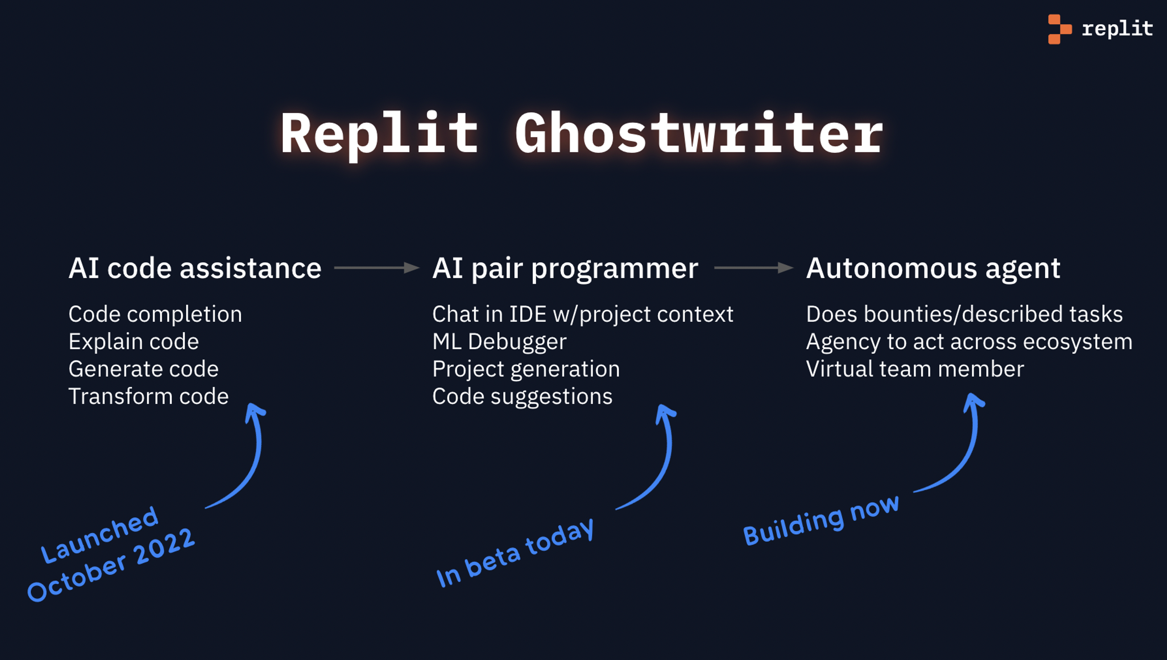 Last fall, we introduced Ghostwriter, Replit’s coding AI, with Complete, Generate, Transform, and Explain Code - coding assistant tools that work with you as you code. Together they made coding faster by automating repetitive tasks and removing the drudgery of writing boilerplate code.