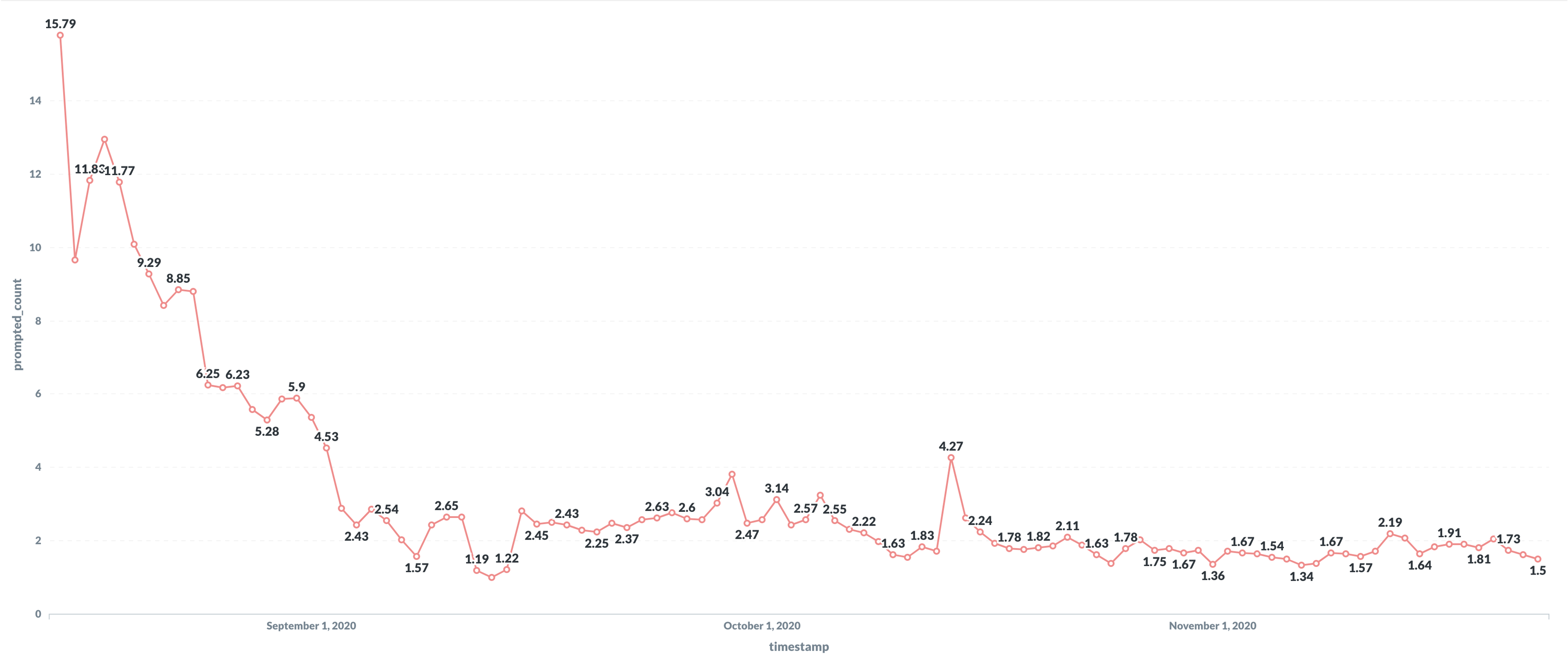 If the websocket connection between the browser and the container closes for any reason, the repl will reconnect automatically. Back in September, 2.81% of reconnections would lead to a prompt asking you whether you wanted to keep your local changes or the server changes. That's a stressful prompt to get! It means Replit cannot automatically reconcile the local edits you've made to your repl with what's in the container. In August it was much higher. We've brought that prompt down to 1.5% of reconnections and are cooking up a fix for a particularly gnarly case that should drop the prompt rate near zero.