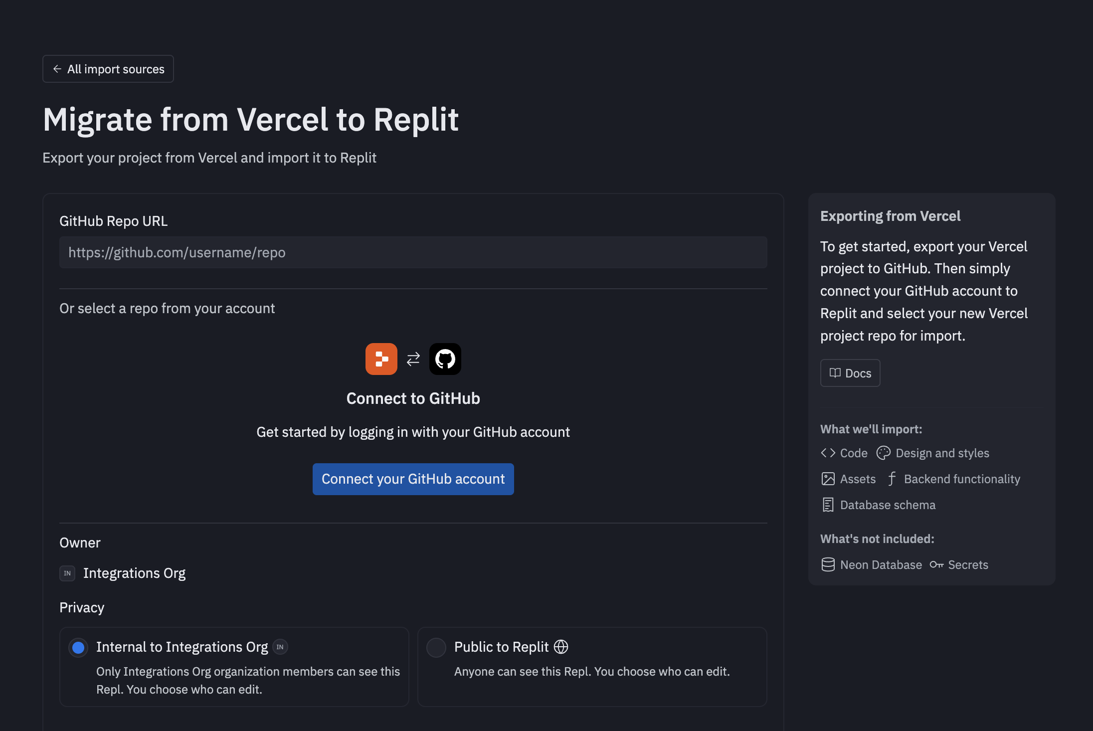 - Open “Import to Replit” From the Import page, choose Vercel.