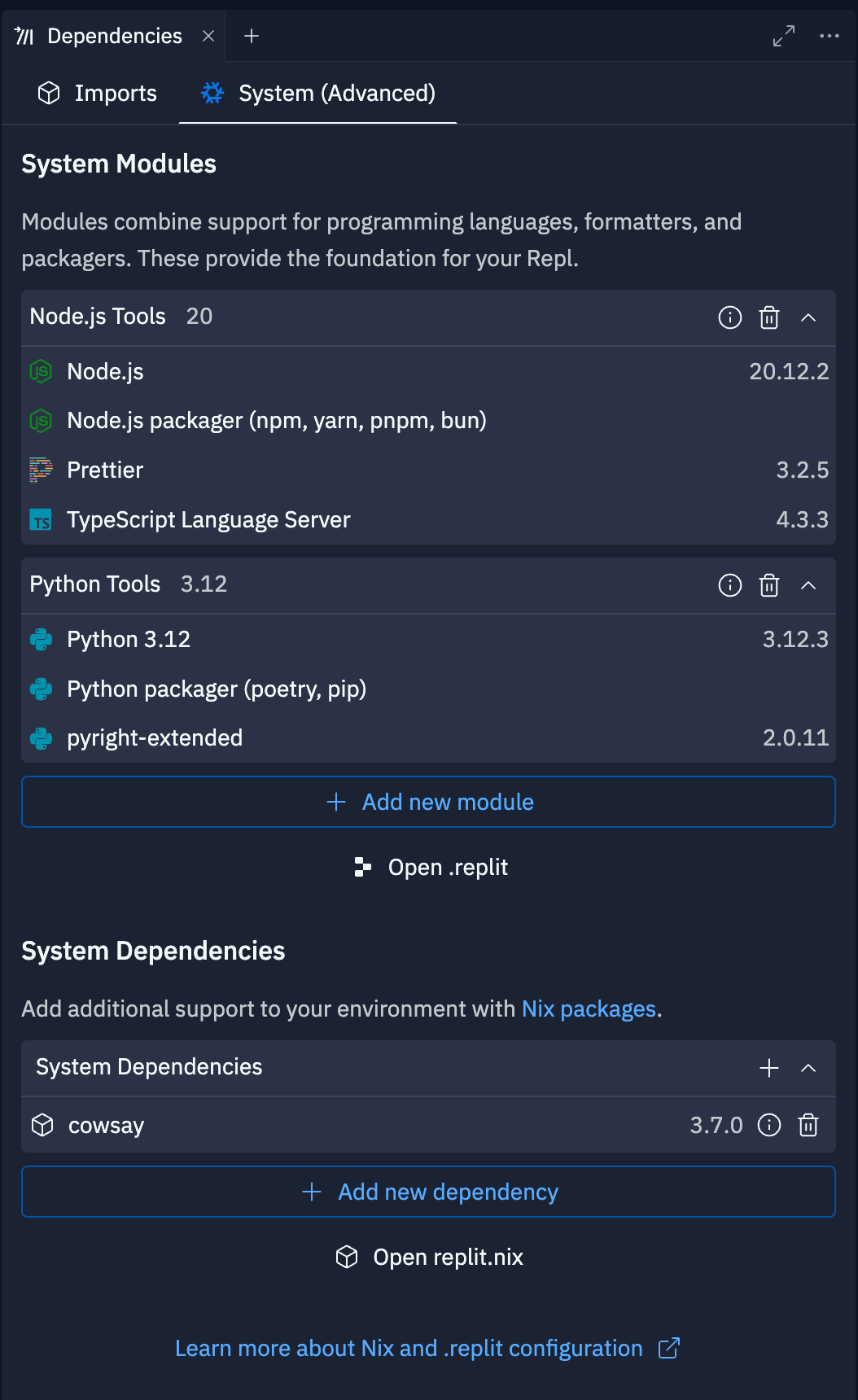 At Replit, we want to make it as easy as possible to spin up a project in the language of your choice without spending too much time on configuration. But, sometimes you have more specific requirements! That’s where System Modules and Dependencies come into play, under the “System” tab.