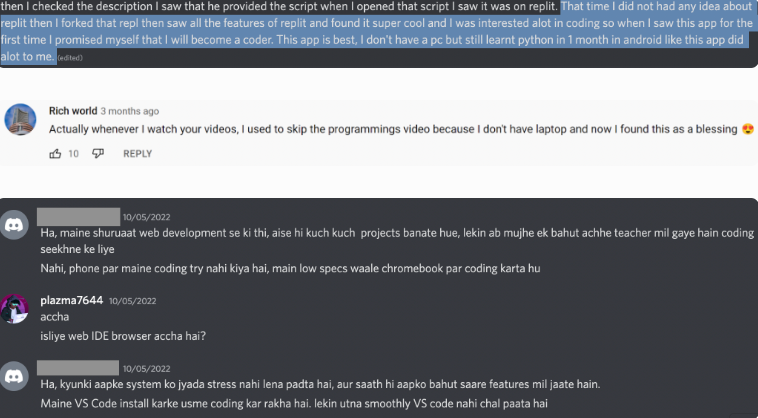 [Translation for the bottom most image: A Chromebook user says they prefer using Replit over VSCode as code runs more smoothly and has much more features]