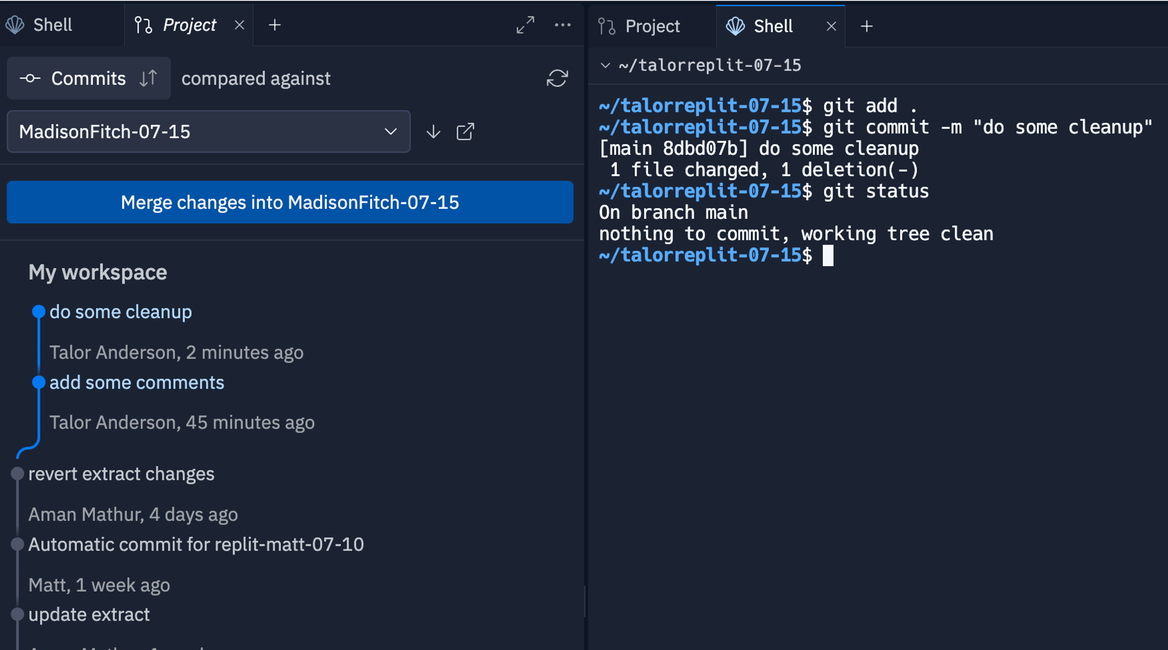 Working with git on Replit is easy. Use our built-in git pane to write commits and view your history, or using our shell tool, you can use whatever git commands or tooling you choose.