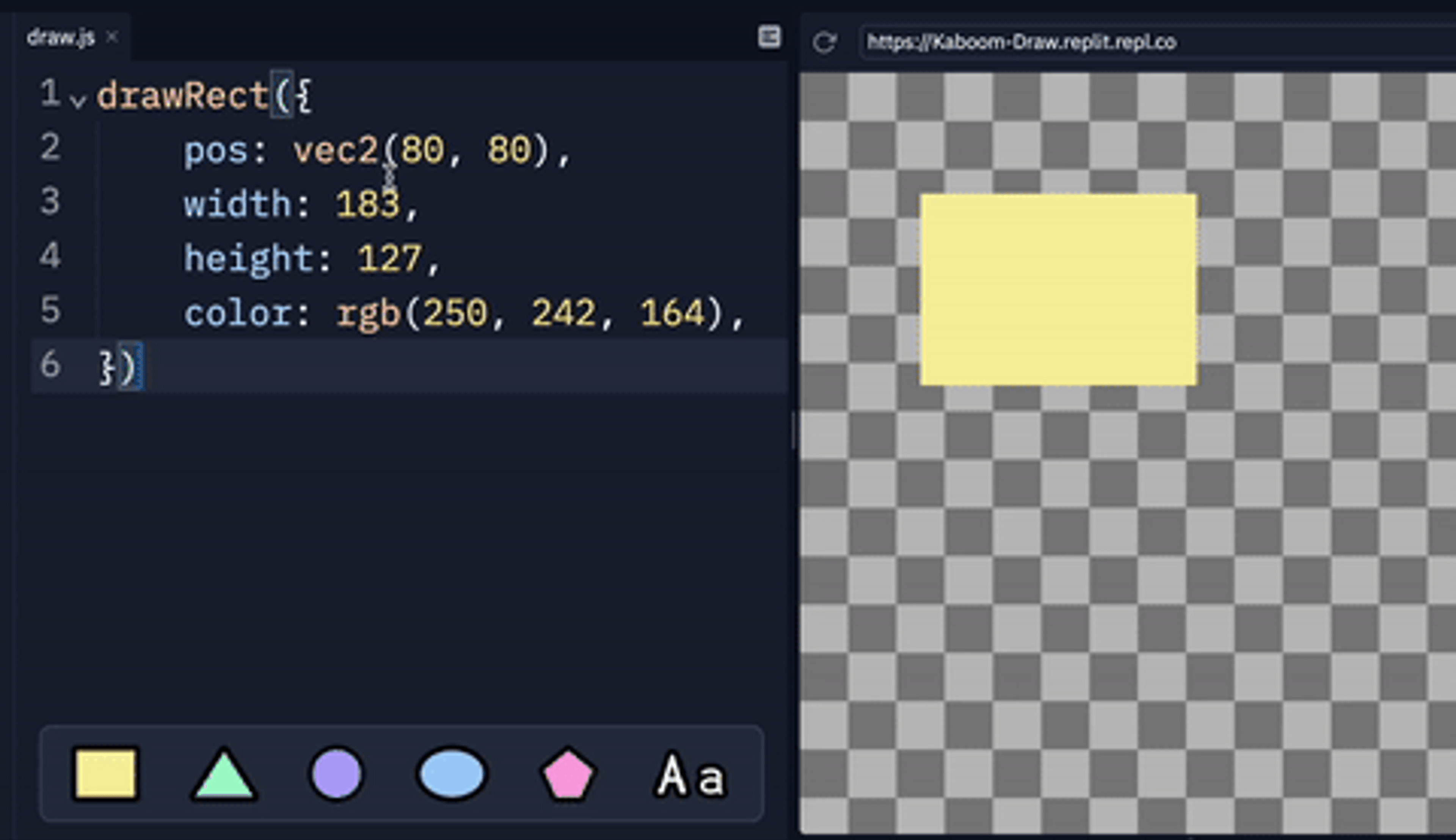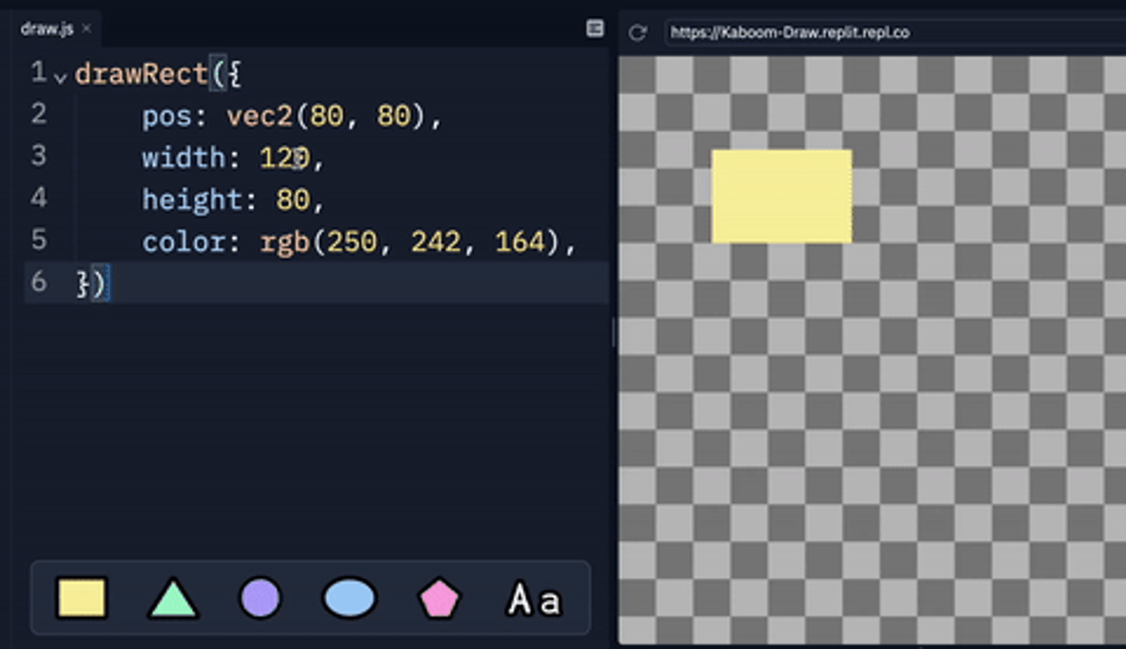 Obviously we need to hook this up to something that can provide live visual feedback, and it's natural to think of our in-house game ibrary Kaboom, which actually has some decent drawing capabilities and has an interface similar to love2d or p5.js where you call drawXXX() functions every frame (which the internal components like sprite() or rect() are built on top of). We can create a template where we evaluate users's code inside a onDraw() event which runs every frame, and since user code are re-evaluated every frame we basically get free no latency live reload! (check out @replt/Kaboom-Draw#main.ts for the inner workings)