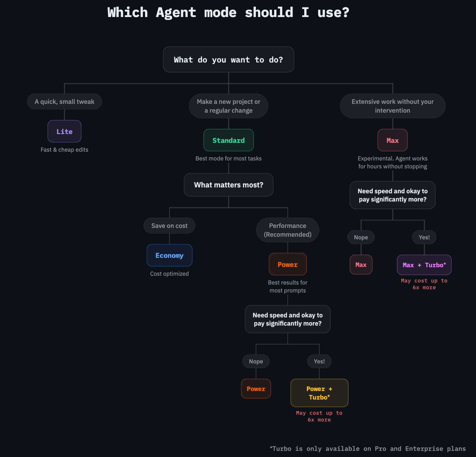 Turbo Mode: 2x faster than Power, using the same models. Requests cost up to 6x more, so this is recommended for experienced builders only. Available on Pro and Enterprise plans.