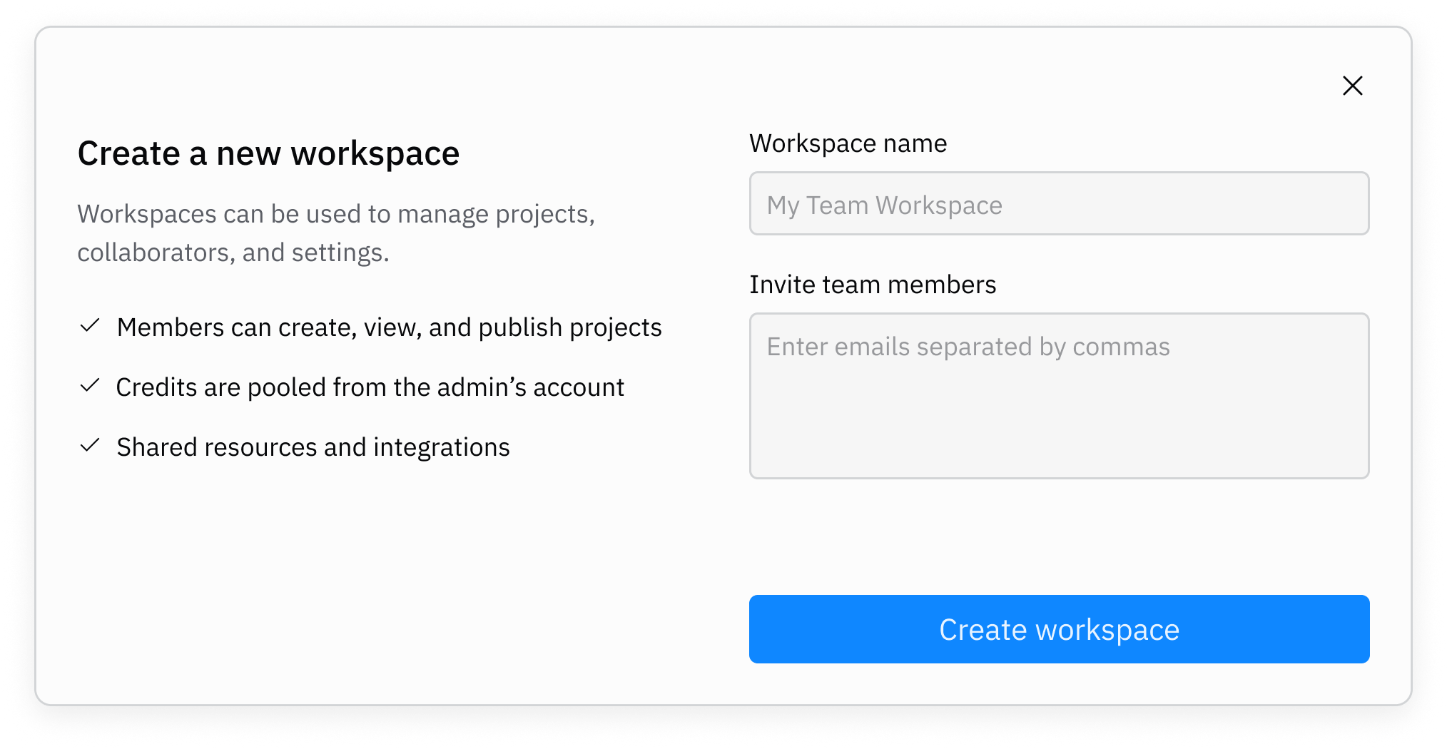Personal and Collaborative workspaces. Keep personal projects in your personal workspace. To build with others, create a collaborative workspace with pooled credits from the admin's account.