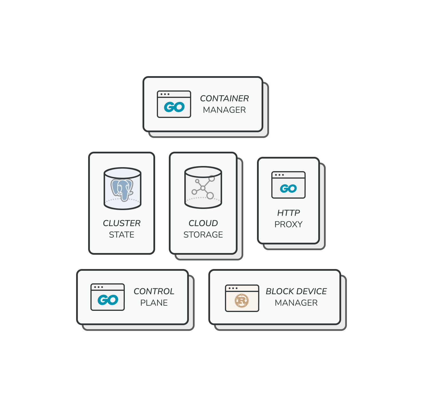These components roughly constitute what we call Goval, the set of infrastructure that runs Repls. What is the best way to organize these pieces? Given that we’re regularly running on the order of tens of thousands of Repls at any one time, this is no small challenge. We want to arrange things in such a way that: