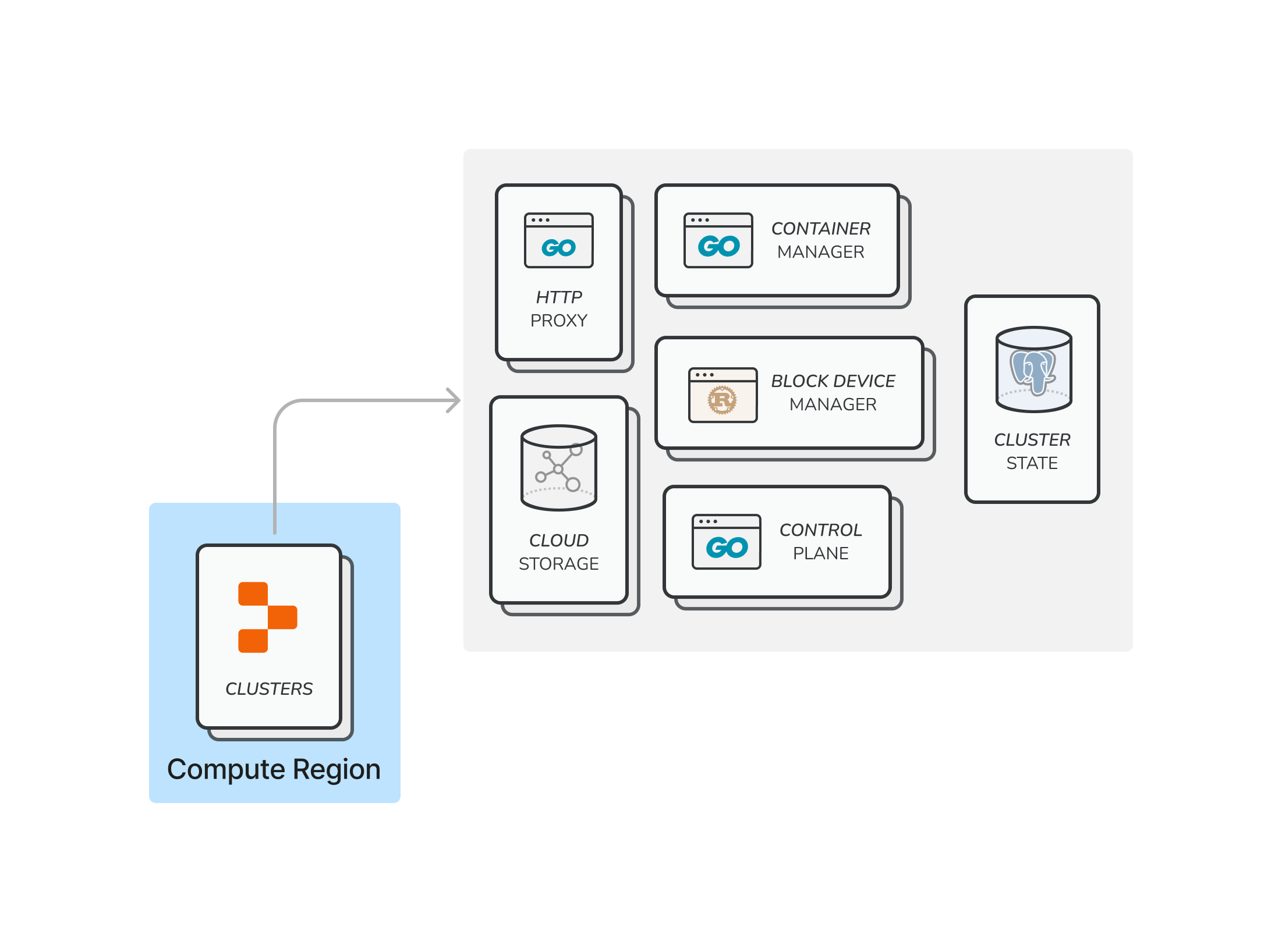 Up until three years ago, we operated the whole infrastructure in a single failure domain. This works fine if you have low enough traffic, but faults can quickly cascade and take down your entire system. In 2021, we took on the effort of partitioning our infra into multiple clusters. A cluster can be visualized as an isolated unit of operation required to run Repls. In most cases, if a single cluster fails, the other clusters remain unaffected. We also developed the infrastructure necessary to track which clusters Repls live in and how to handle transfers between clusters.