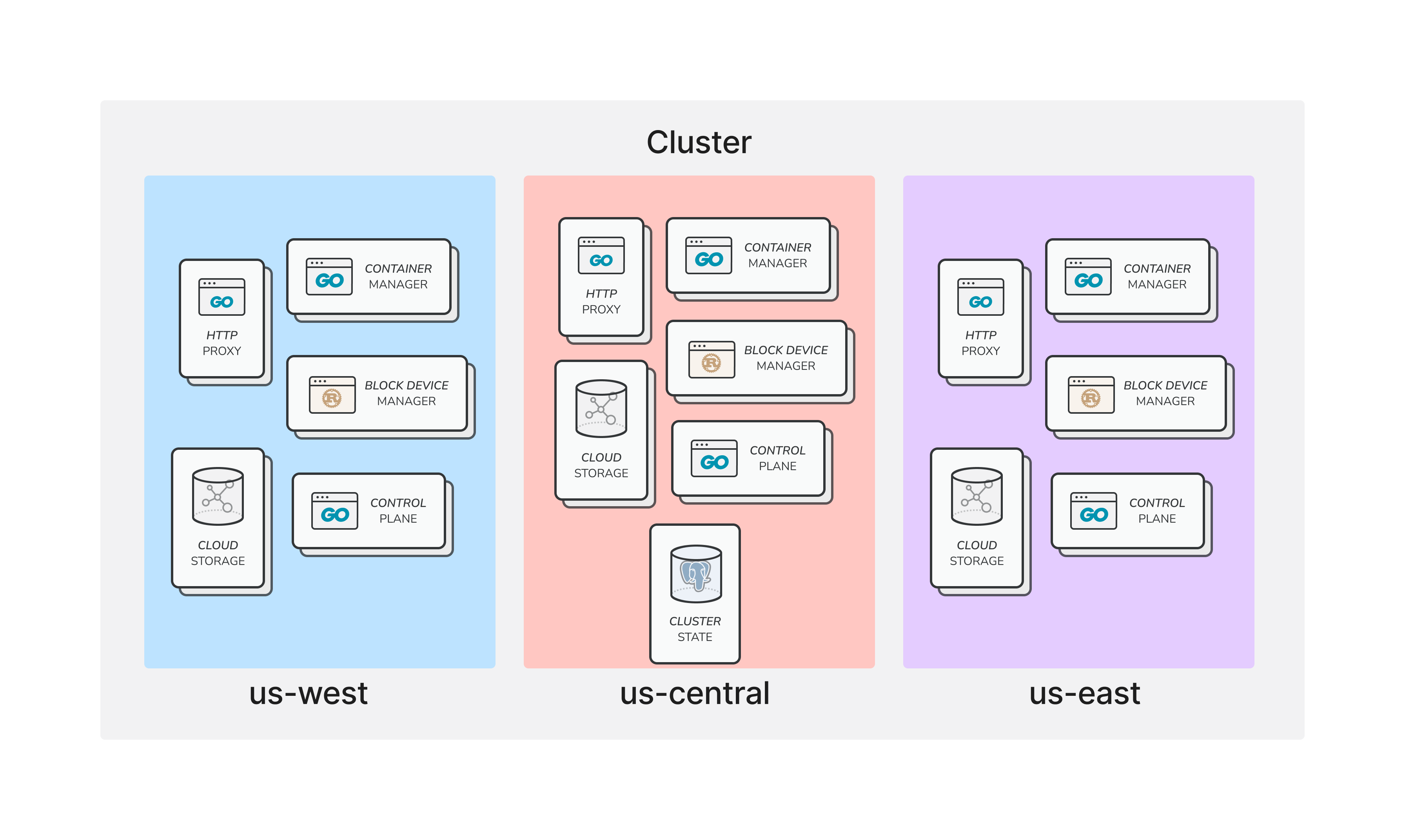 We initially split Repls across clusters on a user membership basis. Having multiple failure domains was a big win for overall reliability and limiting the scope of cascading failures. Over time, we noticed some flaws in our partitioning scheme. We ended up with a free-tier cluster that was much larger than the other clusters. Each cluster also had infrastructure spread throughout the continental United States (multiple US regions in GCP). This caused highly inefficient situations where a single container session could invoke connections across multiple Google Compute regions. Also, the brains of the cluster had to live in a single region (us-central1), meaning that an outage in that region would cause the whole cluster to malfunction.