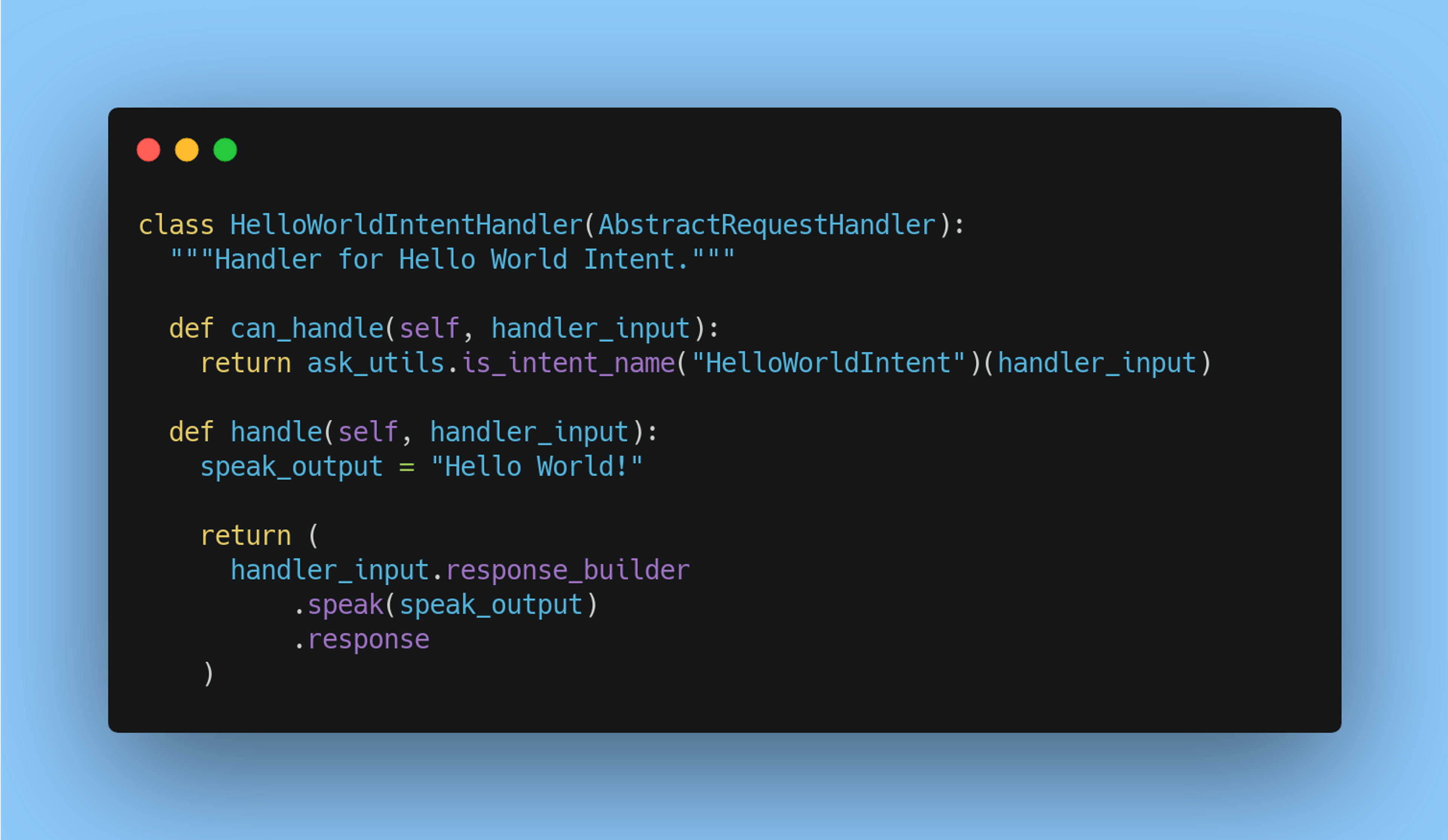 Since we added the GetBlogIntent in the developer console, we have to add an intent handler in our code. Navigate to the intents.py file. Each intent inherits from the AbstractRequestHandler. You must define both the can_handle() and handle() methods for every intent. Our new class will look something like this: