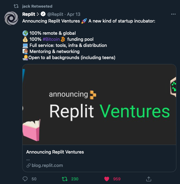 My first day at Replit was April 5, 2021. We launched Replit Ventures on April 13th. I wrote a blogpost detailing the program and our launch Tweet went viral (Thanks Jack Dorsey for the RT).