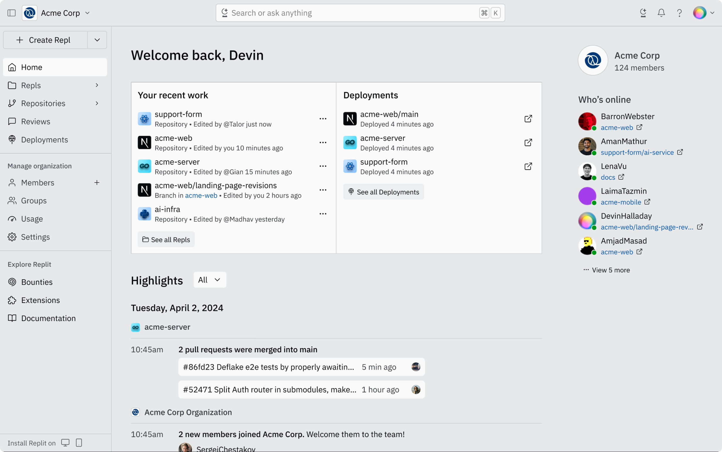 Instant development environments and pre-built team templates come with common components and user interfaces for designers. This lowers the barrier so much that designers with no coding experience have been able to build prototypes on Replit. When assistance is needed, technical teammates can jump in and pair program with live multiplayer (like a Google Doc), both unblocking and upskilling the org.